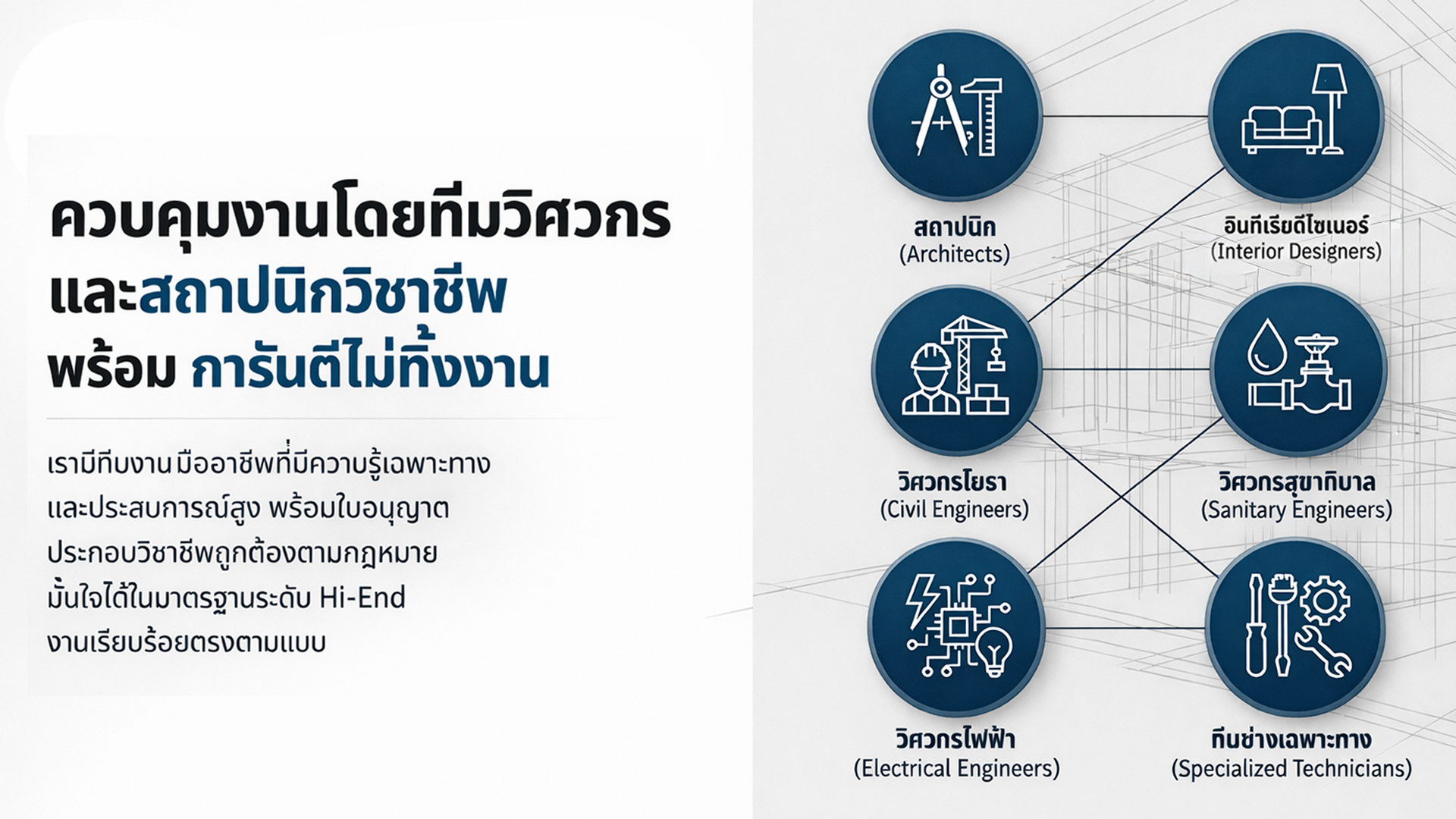 รับวางระบบอาคารครบวงจร โดยวิศวกร ระบบอาคารที่ได้มาตรฐานคือหัวใจของความปลอดภัย ออกแบบและติดตั้งระบบไฟฟ้า ประปา แอร์ โดยทีมวิศวกรวิชาชีพ มั่นใจในความปลอดภัย