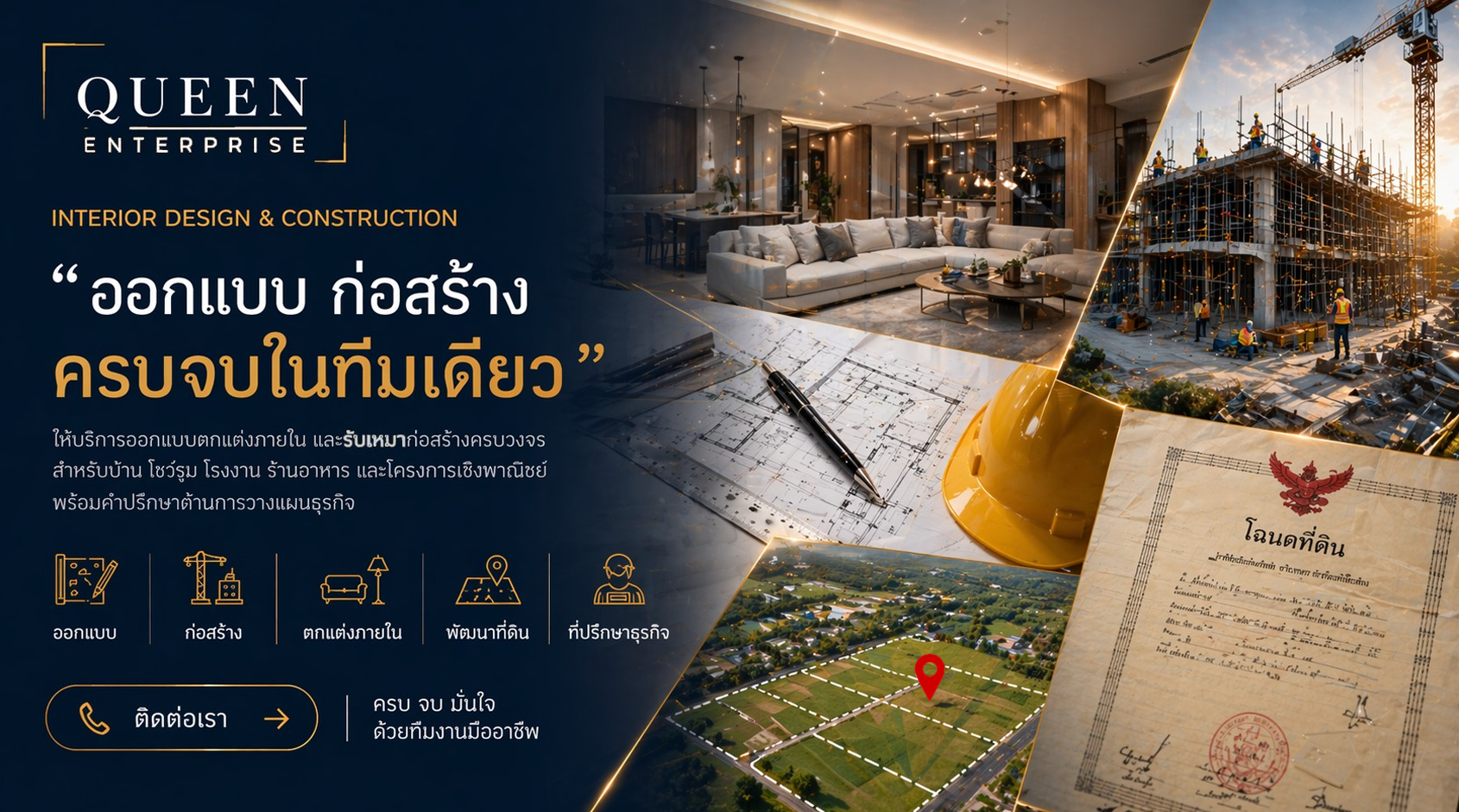 บริการสำรวจและพัฒนาที่ดินครบวงจรตั้งแต่การสำรวจหน้างาน ไปจนถึงแผนพัฒนาโครงการและการก่อสร้าง Modern Luxury — ทีม Queen Enterprise ช่วยเปลี่ยนที่ดินของคุณให้เป็นสินทรัพย์ที่สร้างรายได้ได้จริง พร้อมรายงาน Bank-ready สำหรับยื่นสินเชื่อโครงการ